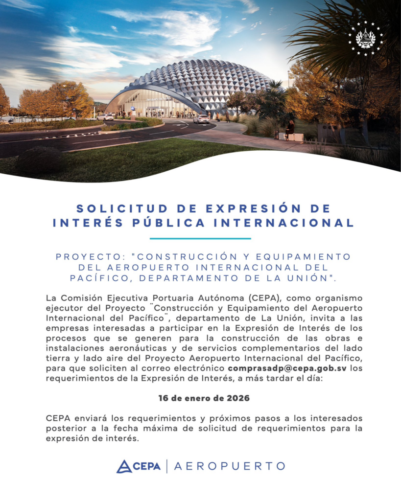 La Comisión Ejecutiva Portuaria Autónoma (CEPA) anunció la apertura de una Solicitud de Expresión de Interés Pública Internacional para el proyecto de construcción y equipamiento del Aeropuerto Internacional del Pacífico, que se desarrollará en el departamento de La Unión, una de las obras de infraestructura estratégica más relevantes para el oriente del país.