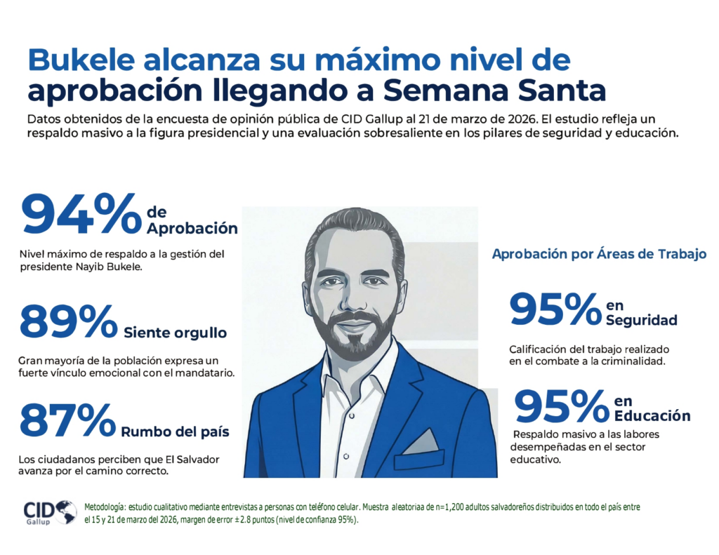 La más reciente medición de opinión pública elaborada por CID Gallup posiciona al presidente Nayib Bukele en su punto más alto de aprobación, con un 94% de respaldo ciudadano, en la antesala de la Semana Santa de 2026.