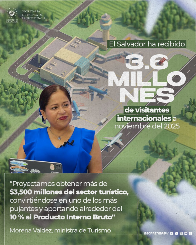 El Salvador continúa posicionándose como uno de los destinos más dinámicos de la región. La ministra de Turismo, Morena Valdez, informó que hasta noviembre de 2025 el país ha recibido 3.6 millones de visitantes internacionales, una cifra que coloca al sector muy cerca de alcanzar la meta anual de 4 millones de turistas.