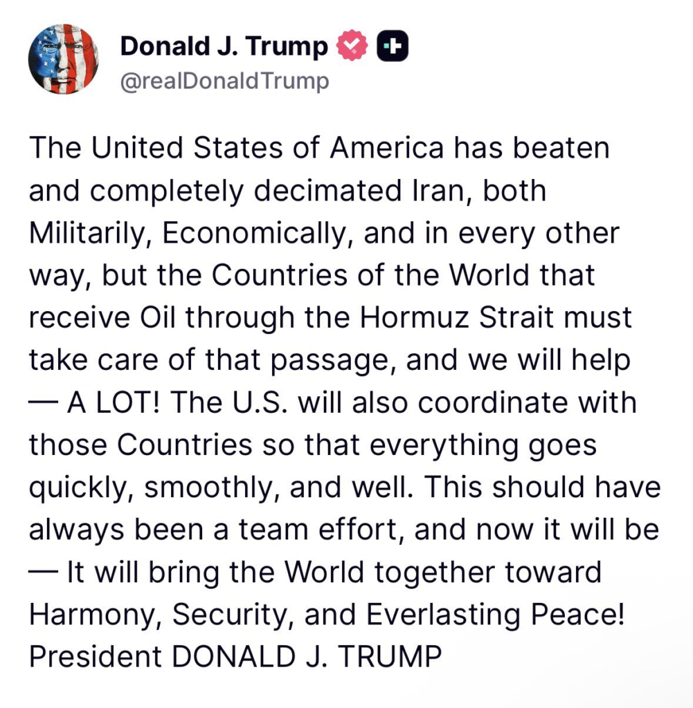 “Los países del mundo que reciben petróleo a través del Estrecho de Ormuz deben encargarse de ese paso, y nosotros ayudaremos —mucho!”, expresó Trump en su mensaje.