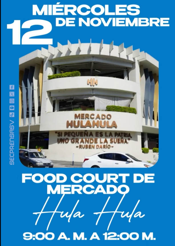 El Gobierno de El Salvador, a través de distintas instituciones, llevará a cabo una nueva edición de la Feria de Oportunidades este miércoles 12 de noviembre en el mercado Hula Hula, ubicado en el Centro Histórico de San Salvador. La actividad se desarrollará en el área del food court del recinto, en un horario de 9:00 a. m. a 12:00 del mediodía.