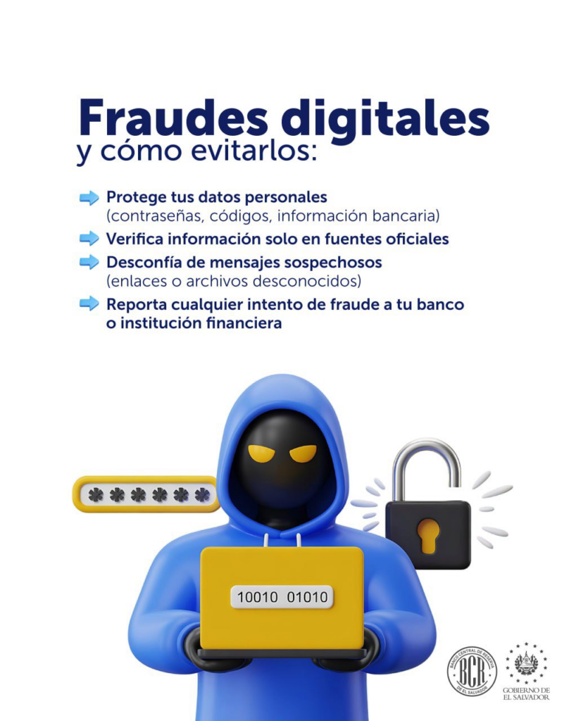 El Banco Central de Reserva (BCR) instó a la población a reforzar sus medidas de seguridad ante el aumento de riesgos en el entorno digital, donde cada vez más salvadoreños realizan operaciones como pagos, transferencias y uso de cuentas digitales.