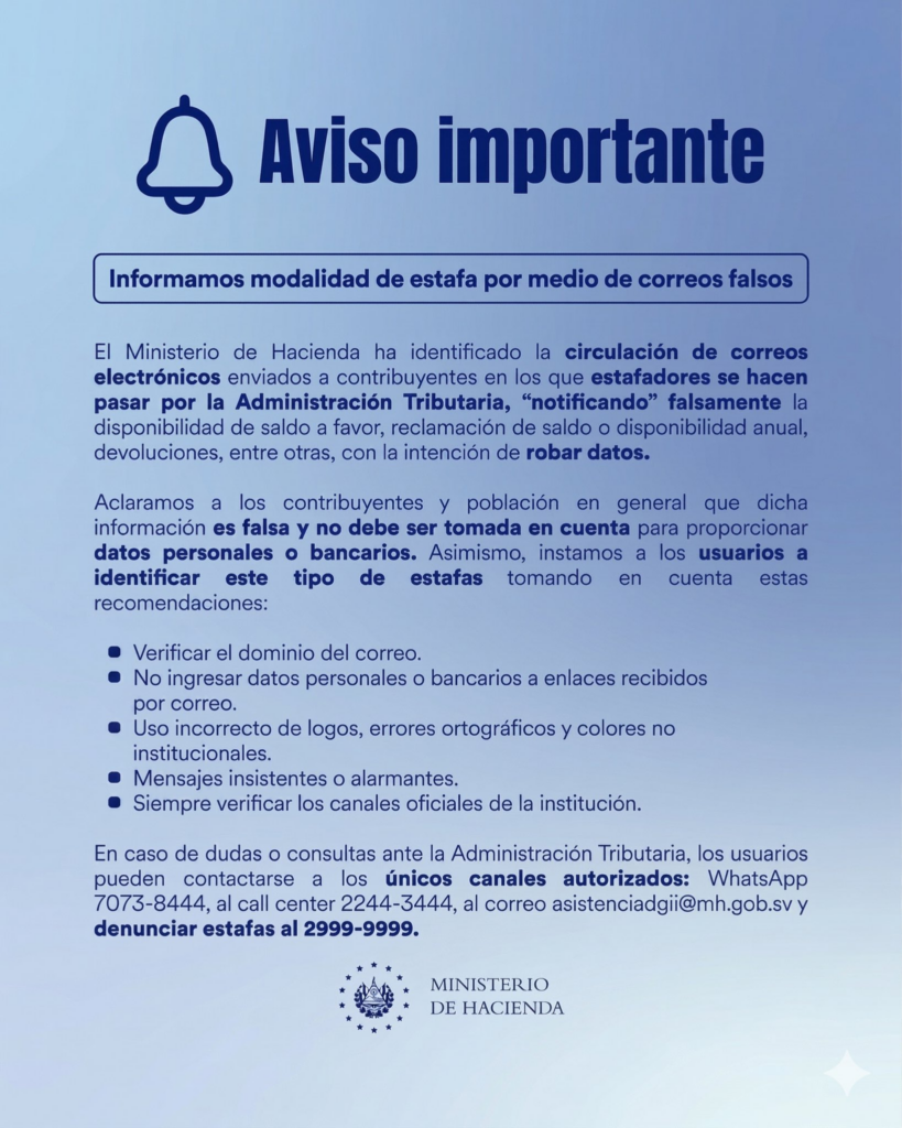 El Ministerio de Hacienda advirtió a la población sobre la circulación de correos electrónicos fraudulentos enviados a contribuyentes, en los que estafadores se hacen pasar por la Administración Tributaria con el objetivo de robar información personal y bancaria.