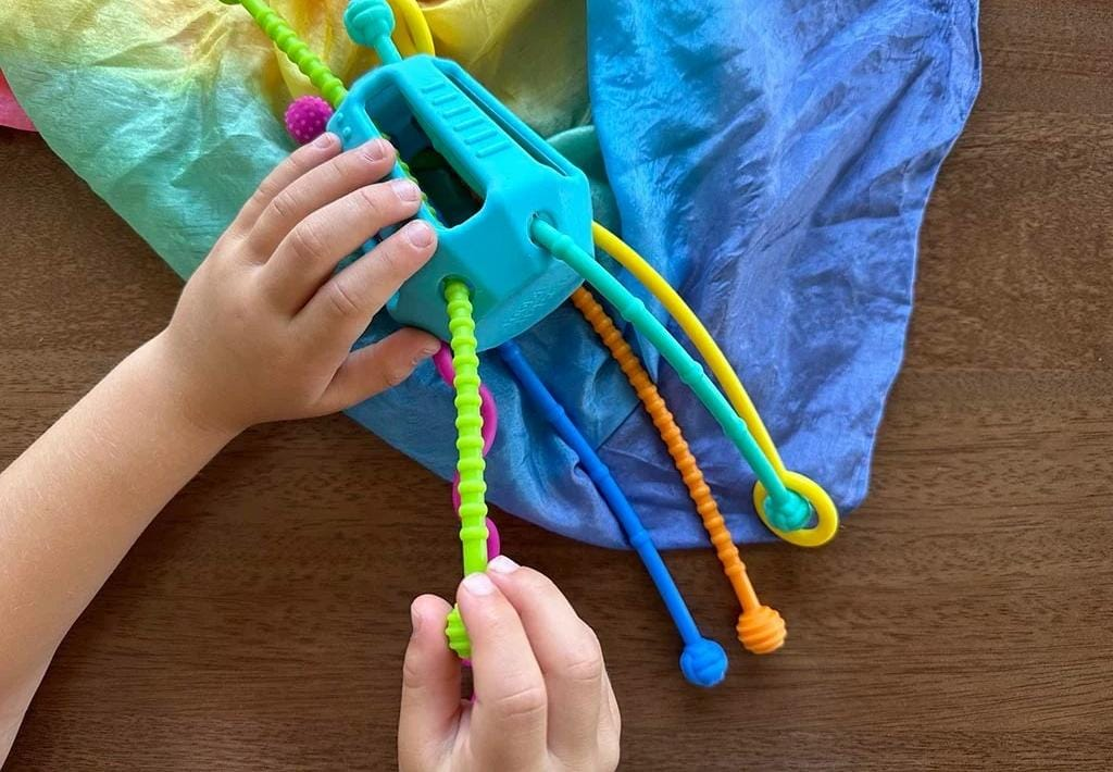 El juguete consiste en una estructura cilíndrica flexible de silicona, de color verde azulado, atravesada por seis cuerdas del mismo material en distintos colores. Cinco de estas cuerdas incluyen una esfera en uno de sus extremos, elementos que, según las autoridades, pueden introducirse en la boca del niño y alcanzar la parte posterior de la garganta, generando un riesgo de obstrucción de las vías respiratorias.