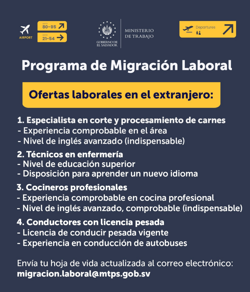 Las personas interesadas deben enviar su hoja de vida actualizada al correo electrónico: migracion.laboral@mtps.gob.sv. Posteriormente, el Ministerio de Trabajo realizará los procesos de revisión y selección correspondientes, conforme a los lineamientos del programa y a los requerimientos de los empleadores en el extranjero.