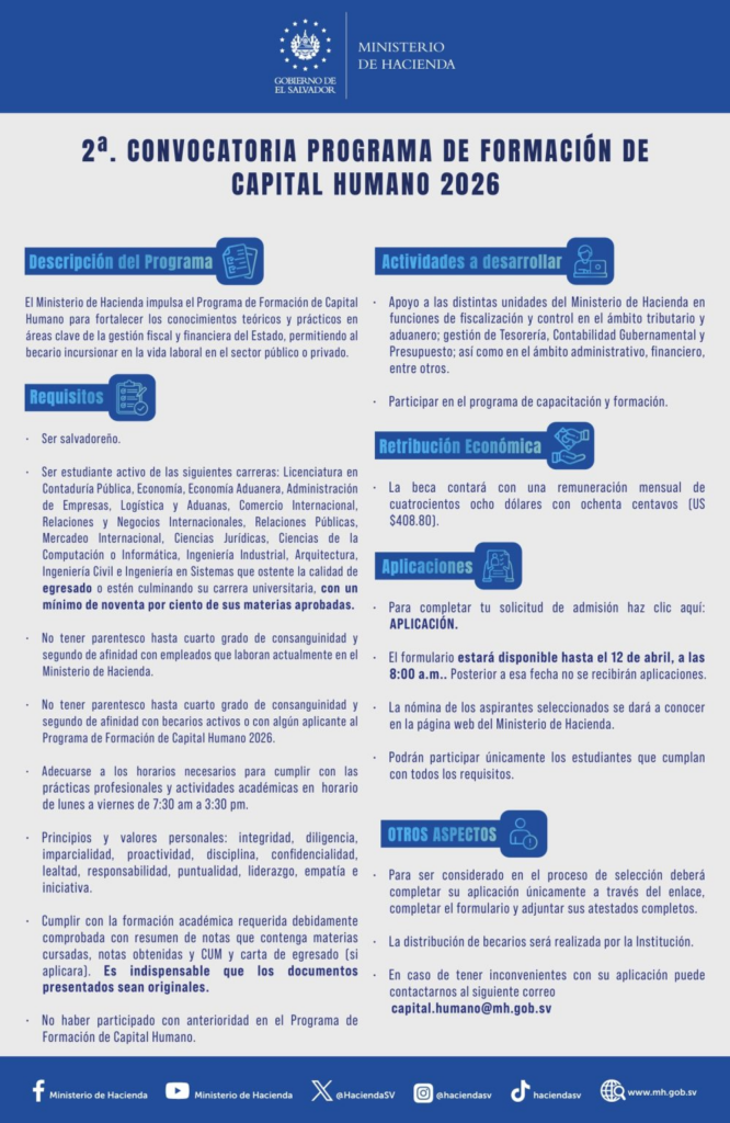 El Ministerio de Hacienda de El Salvador, en coordinación con el Gobierno de El Salvador, anunció la segunda convocatoria del Programa de Formación de Capital Humano 2026, una iniciativa orientada a fortalecer las capacidades profesionales de estudiantes universitarios y facilitar su inserción en el ámbito laboral, tanto público como privado.