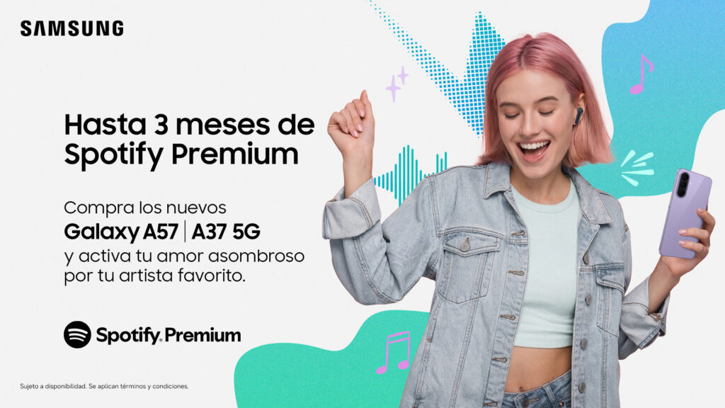 Samsung anuncia una alianza con Spotify, la plataforma de streaming musical más grande del mundo, en una colaboración en América Latina que ofrece hasta tres meses de Spotify Premium para los consumidores que adquieran los nuevos Galaxy A57, Galaxy A37, Galaxy A1 y Galaxy A07, colocando la música en el centro de la experiencia de la nueva línea Galaxy A. Spotify Premium garantiza acceso a música sin anuncios, descargas para escuchar offline y más libertad para elegir qué escuchar en cualquier momento.