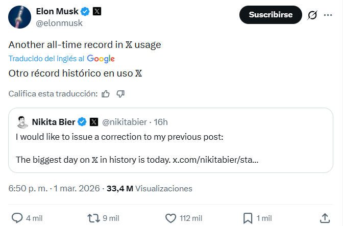 La afirmación citaba un tuit de Nikita Bier, jefe de producto de la compañía, quien aseguró: “Hoy ha sido el día más grande en la historia de X”.